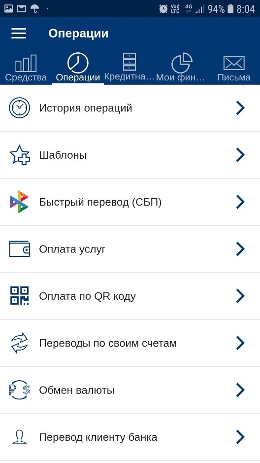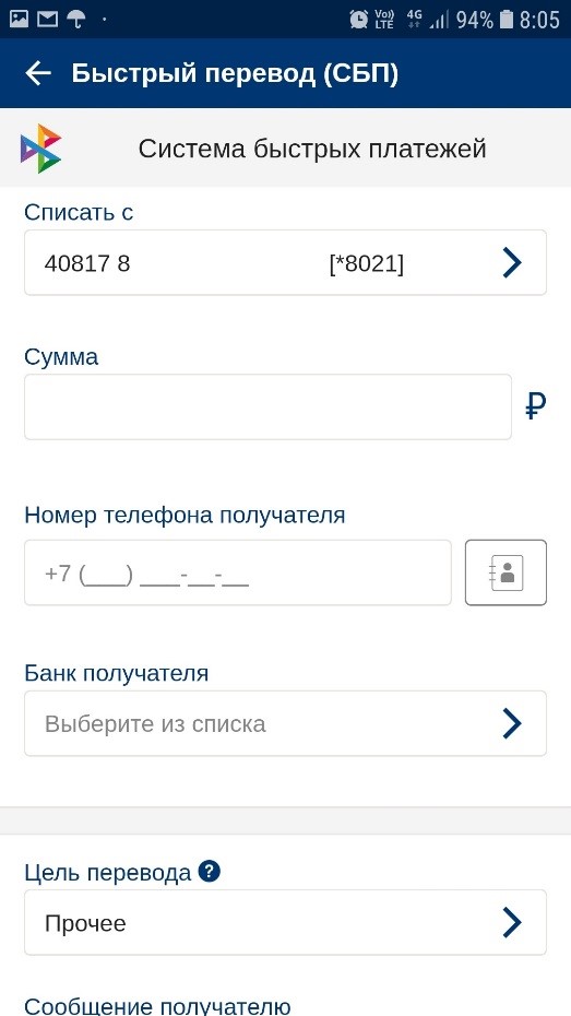 В разделе «Операции» достаточно выбрать пункт «Быстрый перевод (СБП)» и заполнить форму: счет списания, телефон получателя, банк получателя и сумму перевода.